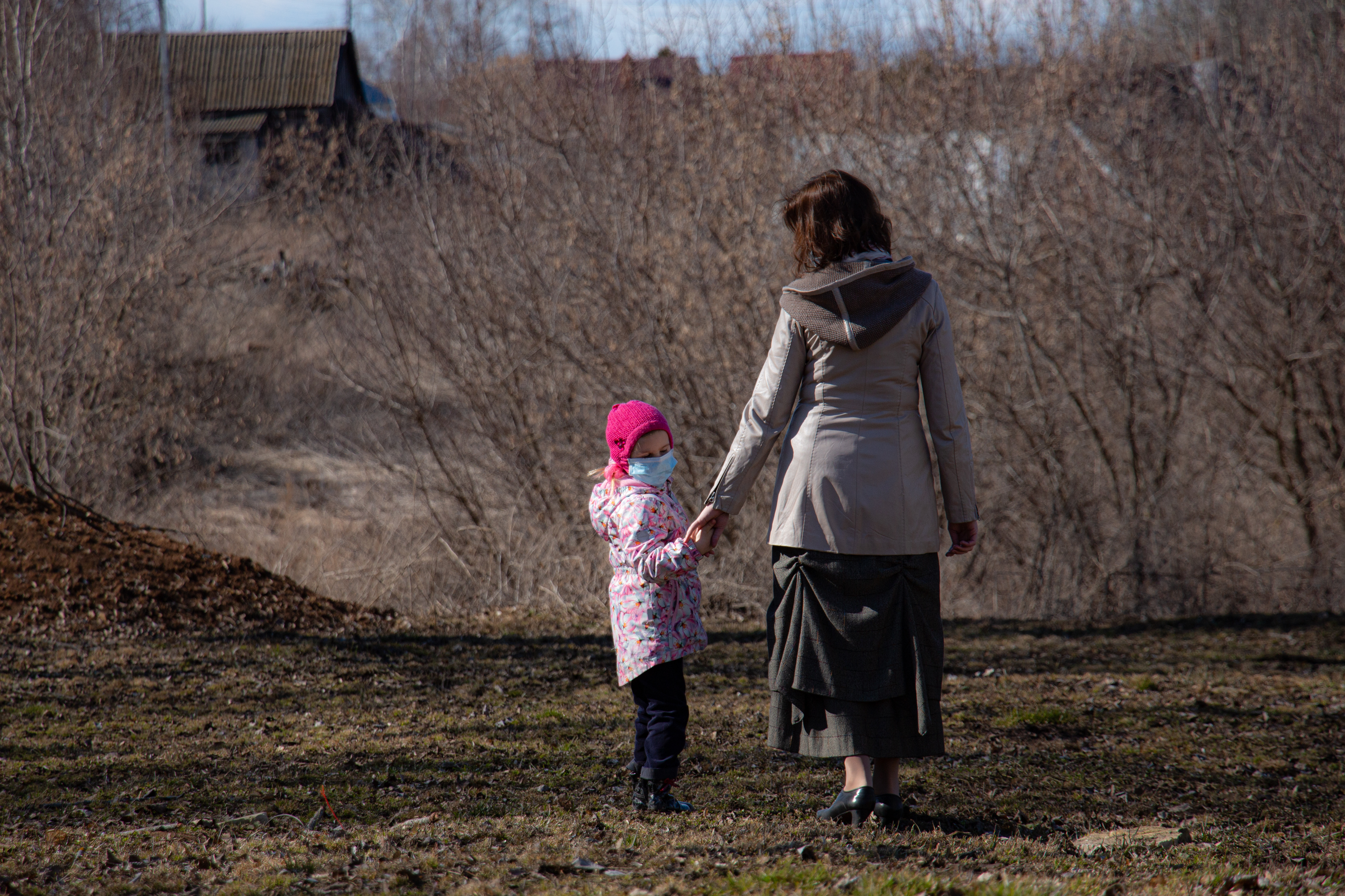 Mother and daughter outdoors wearing protective masks