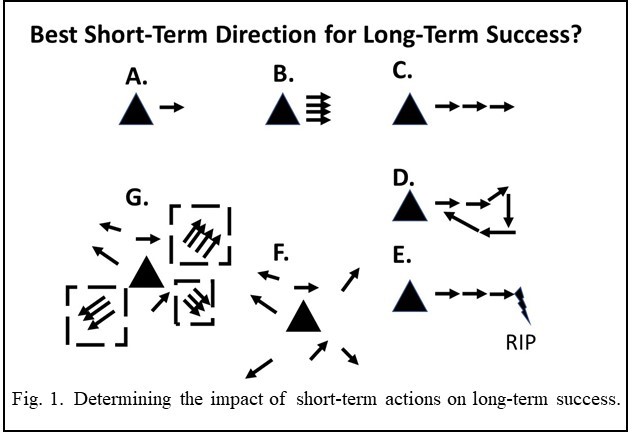 For all types of planning, linking long-term outcomes to real-time activities is difficult. Any individual short-term action can move us in a specific direction (Fig. 1A). Often, we repeat the same steps over and over (Fig. 1B) or in a progressive fashion (Fig. 1C). However, we cannot always predict where we will end up (Fig. 1D), and unexpected events can derail our progress (Fig. 1E). Creativity can lead to new innovations or lack of coordination (Fig. 1F) that can be positively or negatively influenced by our professional associates (Fig. 1G). As this array of options shows, without long term goals to assess progress, it is impossible to evaluate whether short-term actions accumulate conservation success over a longer time frame.